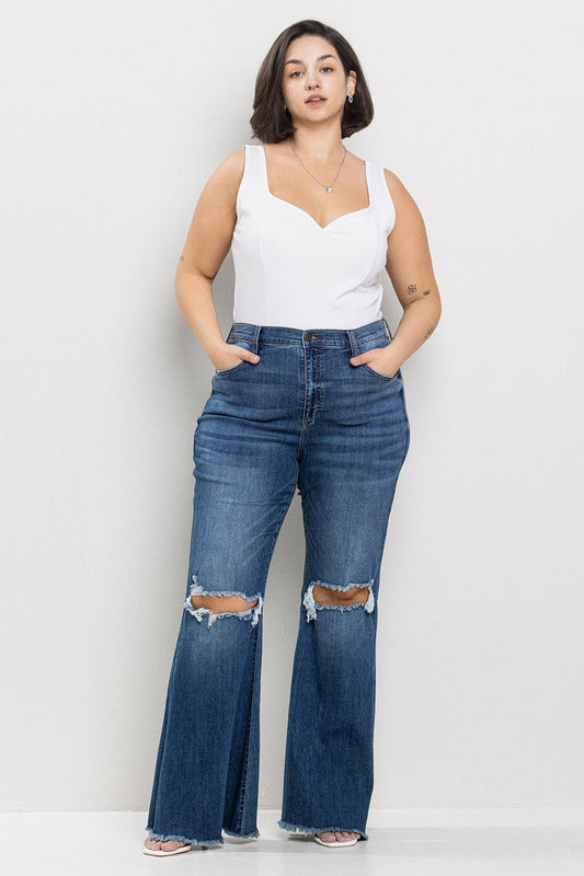 HIGH RISE PLUS FLARE W/ RIPPED KNEES AND FRAY