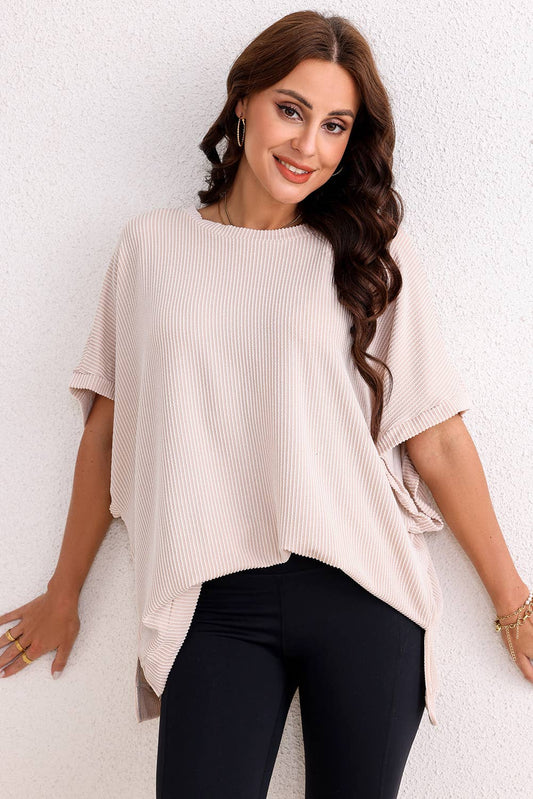Ribbed Knit Batwing Sleeve Tunic Oversized T Shirt