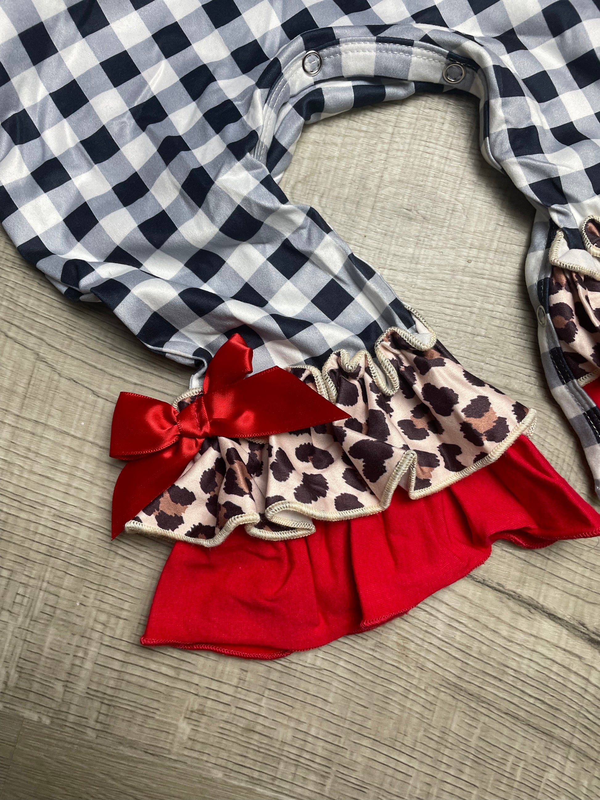 Dress up your tiny tot in this plaid romper featuring a playful leopard mickey applique. The stretchy fabric is perfect for any active little one!